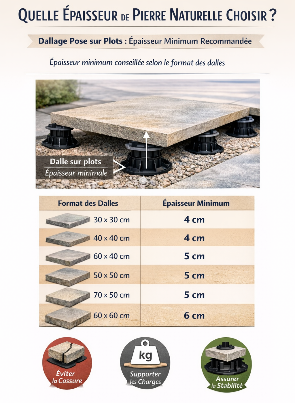 Le choix de la bonne épaisseur de pierre naturelle est un élément fondamental pour garantir la résistance mécanique, la stabilité dans le temps et la sécurité des ouvrages. L’épaisseur varie en fonction du format des dalles, du type de pose et de l’usage (terrasse, circulation, zone privée ou publique).