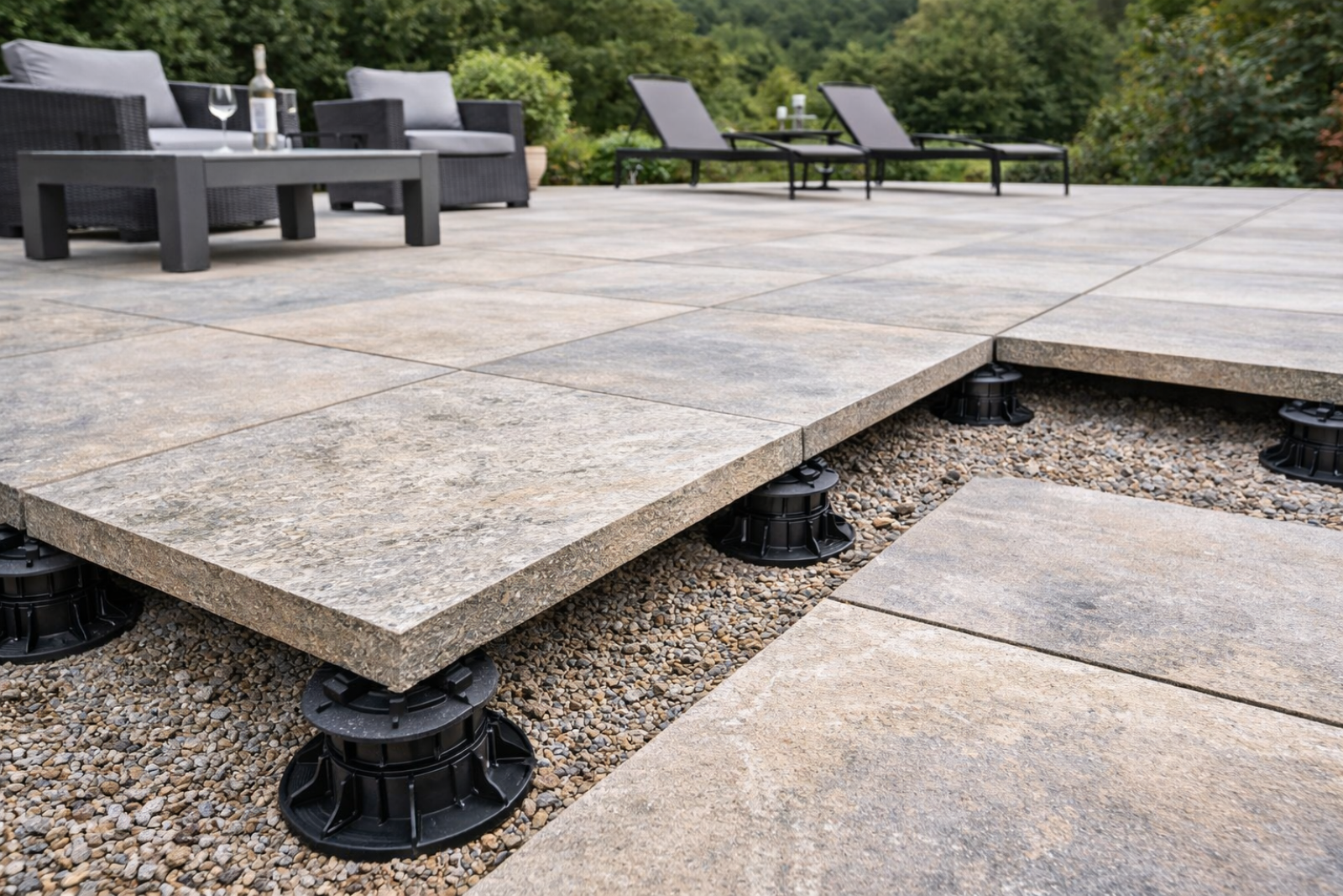 Dans le cas d’un dallage en pierre naturelle posé sur plots, les contraintes sont plus importantes qu’en pose collée ou scellée. La dalle doit être autoportante et capable de supporter les charges sans risque de casse ou de flexion.