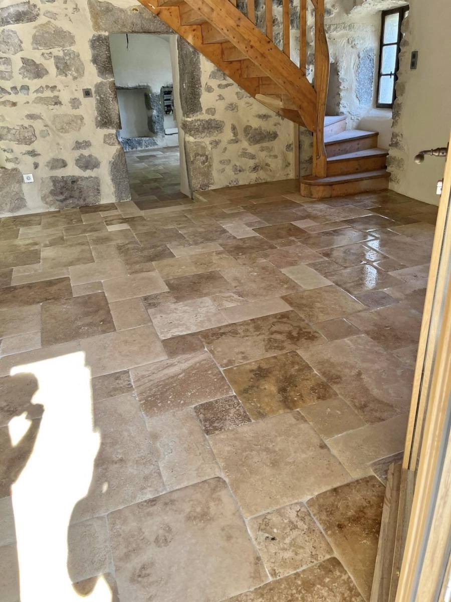 Facilité d'entretien : Avec un entretien régulier, les sols en Travertin peuvent rester magnifiques pendant des années. Un simple nettoyage périodique et un scellement occasionnel sont souvent suffisants pour préserver sa beauté.