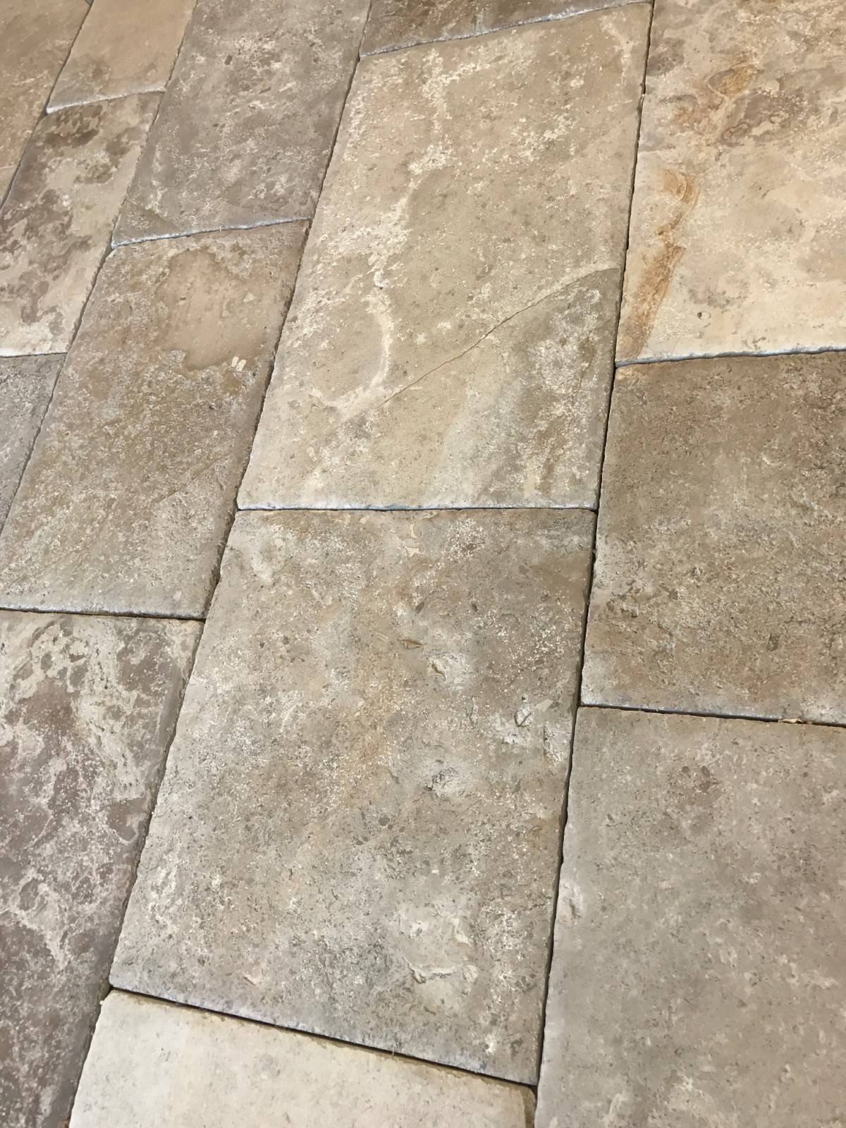 Reproduction de dalles anciennes : à partir d’une dalle en pierre, nous vieillissons à la main afin d’obtenir un véritable sol « centenaire » digne d’un vieux manoir, d’un château ou d’une abbaye.